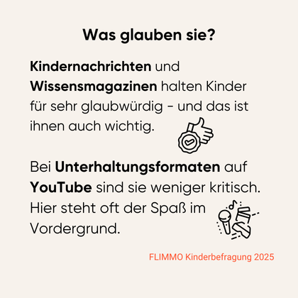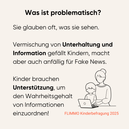Kinder wachsen mit Videos, Clips und Posts auf. Schon Grundschulkinder suchen online nach Antworten – doch nicht alles, was sie sehen, stimmt. Dieses FLIMMO-Special zeigt, wie Eltern ihr Kind im Umgang mit Falschinformationen stärken und bei der Suche nach Informationen im Netz begleiten können. Denn die aktuelle FLIMMO-Kinderbefragung hat ergeben, dass Kinder oft unsicher sind, wie man seriöse Informationen erkennt. Hier gibt es eine Checkliste für Familienopen_in_new, die beim Umgang mit digitalen Informationen helfen kann.